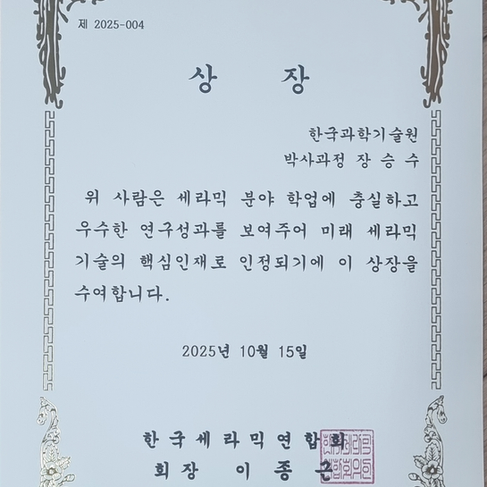 장승수 학생은 세라믹 분야 학업에 충실하고 우수한 연구성과를 보여주어 미래 세라믹 기술의 핵심인재로 인정되어 '한국세라믹학회 연합회 회장상' 을 수상하였습니다.